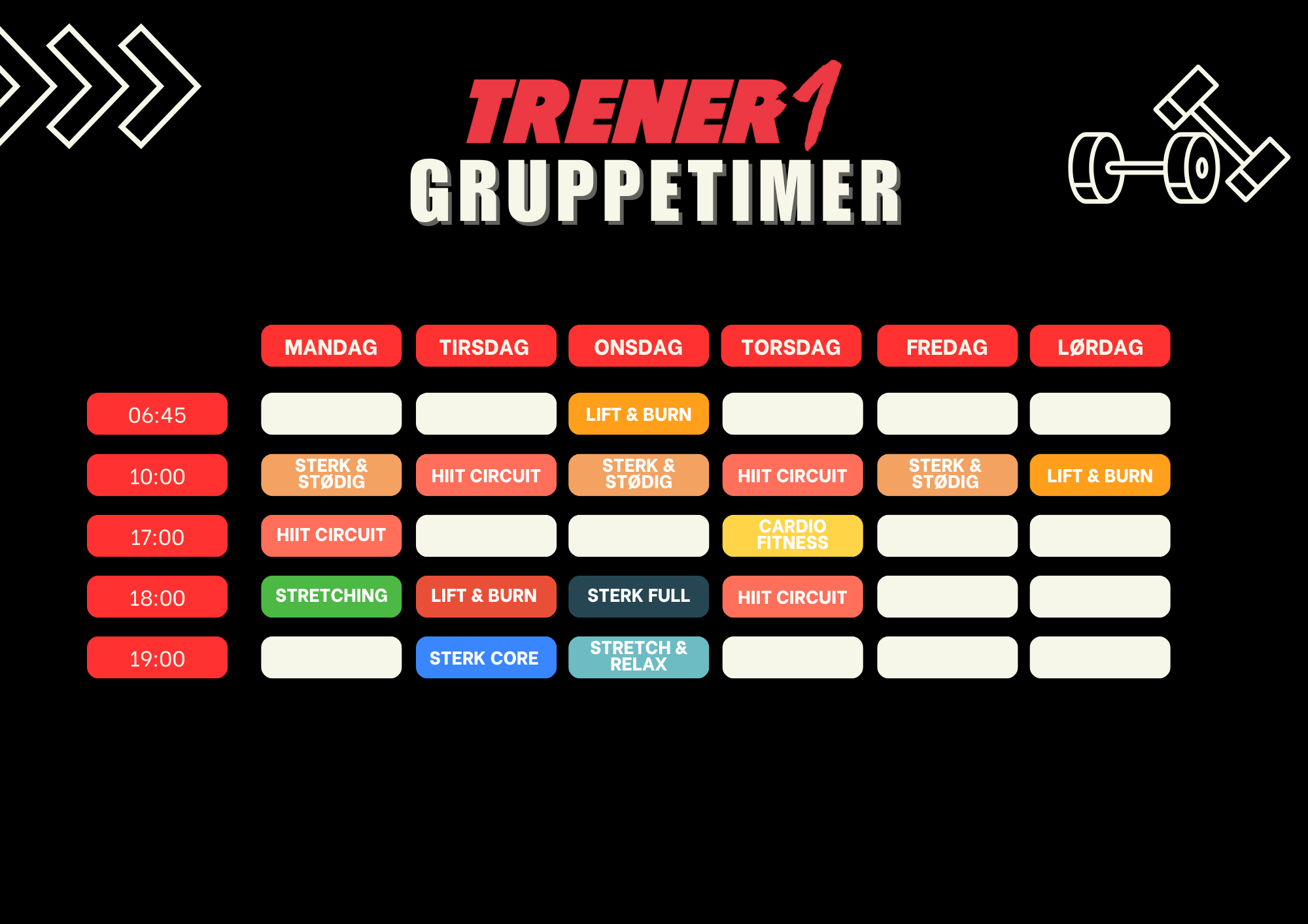 Vi tilbyr et bredt spekter av timer, og velger du en variasjon av vårt treningsilbud gjennom uken kan du være sikker på at du får trent hele kroppen. Du vil bli sterkere, sprekere og mer atletisk. I tillegg legger vi til rette for restitusjon og avslapning i løpet av uken, slik at du kan yte maks når det gjelder.